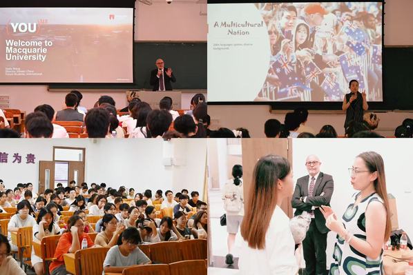 签约仪式结束后,麦考瑞大学代表团面向管理学院、经济学院及国际商学院学生举办本硕连读项目宣讲会,详细解读赴麦考瑞大学留学的优势。王桃以“你好澳大利亚——打开国际视野的第一步”为主题,围绕澳中紧密的经贸与教育关系,激励学生通过出国留学拓宽全球视野、实现学术与职业更高层次的发展。蒋婷婷则重点介绍了麦考瑞大学商学院,向学生展示麦考瑞大学的学术优势与学习体验:麦考瑞商学院是全澳排名第2的商学院,获得AACSB、AMBA双重认证。市场营销、金融学、管理学等多个商科专业均位列全球前50位,且主校区毗邻“悉尼硅谷”——麦考瑞科技创新园区,是谷歌、微软等数百家全球知名企业在南半球的总部所在地,为学生提供了丰富的实习、就业和创业的机会。