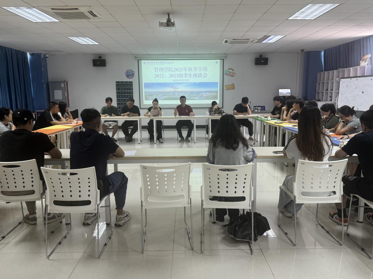 本网讯(记者 徐可 王凯萤 姚焮月)为倾听学子心声,共促校园发展,9月16日至17日,管理学院在A8-109室召开两场学生代表座谈会。管理学院党总支副书记戴杰、学工办副主任、各年级辅导员及来自不同年级专业的学生代表共同参与,会议围绕教学管理、校园服务生活、学生发展及校园建设等议题进行深入交流。