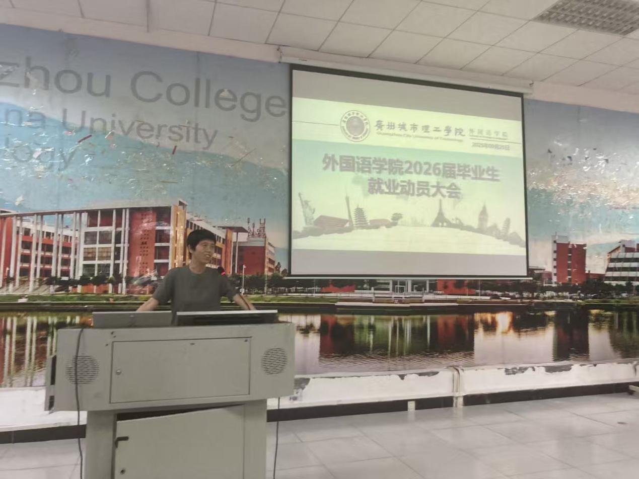 本网讯(记者 李小蕾)为帮助2026届毕业生提前明晰就业方向、提升求职竞争力,9月25日下午,外国语学院在A6-101召开2026届毕业生就业动员大会。学院常务副书记李伟、毕业班辅导员及全体2026届毕业生参会,特邀广州易海创腾信息科技有限公司交付中心总经理朱颖仪作为企业代表,联动为学子送上针对性就业指导。
