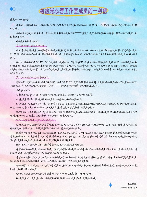 整场分享既有理论高度,又贴近实际,让成员们在思考与共鸣中收获良多。肯定与赞赏、理解与陪伴,珠宝学院聚焦“人”与“情”,为这些默默付出的成员们写了一封信,鼓励成员们在服务中照亮自己,也温暖他人。本次培训不仅是一次专业学习,更是一次心灵的靠近。成员们在交流中凝聚共识,在倾听中坚定方向。未来,拾光心理工作室将继续以专业与温情并重的方式,践行“倾听、陪伴、解答、守护”的承诺,为师生的心理健康点亮一束温暖的光。