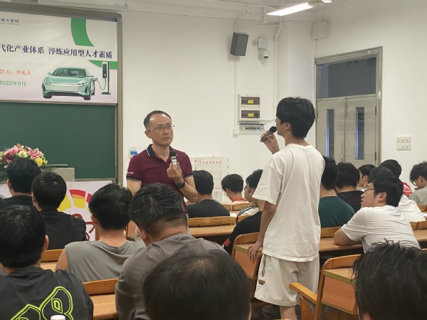 李礼夫将现代化产业体系与汽车工业发展相结合,指出新能源汽车是建设制造强国的必由之路,汽车产业对现代化产业体系构建具有重要影响。他勉励学生明确专业定位,将个人学习与汽车产业智能化、绿色化转型需求相衔接,强调加快发展新质生产力必须依靠科技、人才、教育“三驾马车”协同驱动。他还从新能源驱动、智能网联、自动驾驶等方面系统介绍了现代汽车技术及未来发展趋势,鼓励学生把握时代机遇,勇立潮头,实现个人成长与行业进步同频共振。
