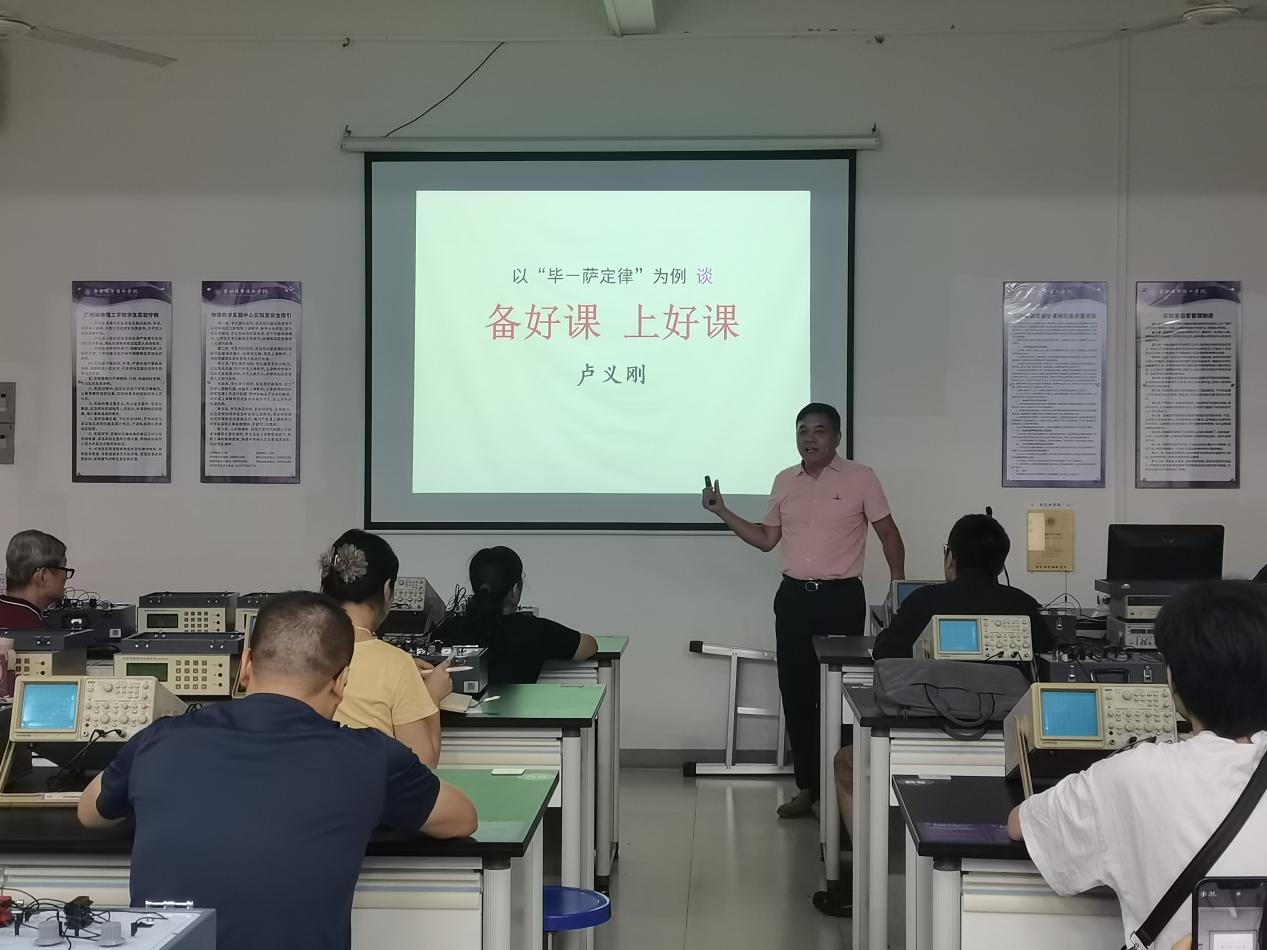 本次示范课由物理教学实验中心主任卢义刚教授担任主讲人。他以“‘毕-萨定律为例’,谈备好课、上好课”为主题,结合自身多年教学实践,向在场教师生动且细致地分享了丰富的教学经验与独到的授课心得。他从精准定位每堂课内容在整门课程中的定位、课前准备互动问题、明确教学目标、规划教学内容、合理结合AI辅助、精确时间安排、恰当融入课程思政元素、经典案例分析、新物理量拓展、课堂练习、对称性思维拓展等十个方面,对“毕-萨定律”这一堂课的知识进行了精准剖析和讲解。为让教学方法更具可操作性,卢教授还通过具体案例进行生动演示与深入阐述:例如,通过电场和磁场的同步类比、帮助学生借助已知知识理解未知概念,降低学习难度。以生动有趣的文学诗词引入“卢瑟福实验”,打破学科壁垒,让抽象的物理实验更具文化韵味与吸引力。通过“一步一动”的多媒体动态演示,将复杂的物理过程可视化,助力学生快速把握核心原理。同时,采用启发式互动交流方式,引导学生主动思考、积极提问,营造活跃的课堂氛围。