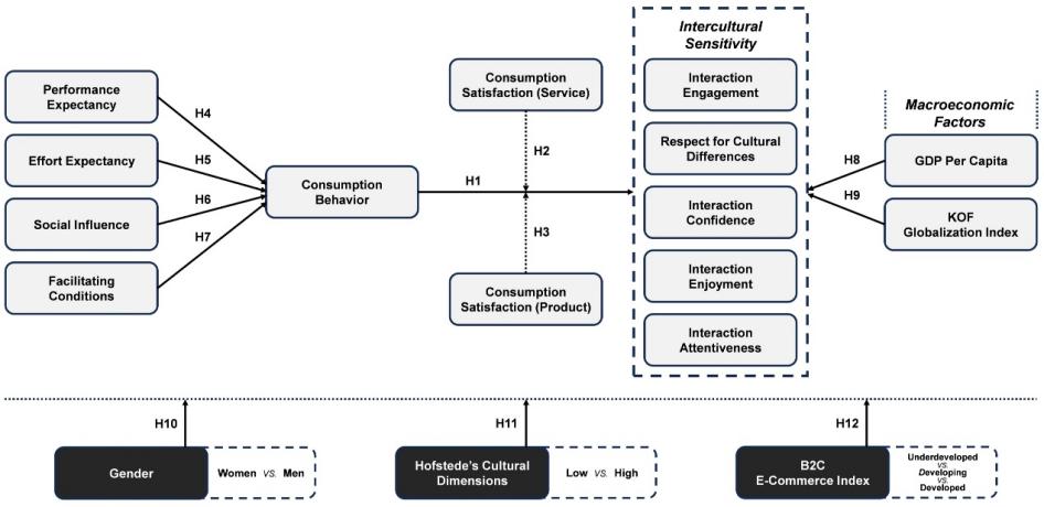 该论文首次将跨境在线购物视为一种“非正式多元文化体验”,探讨其在全球消费者层面上的社会心理影响。研究结合了国家层面的人均GDP、全球化指数等宏观指标,构建了以技术接受与使用统一理论(UTAUT)和跨文化敏感性量表(ISS)为基础的综合模型。通过一项来自69个国家、1512名消费者的全球调研,研究利用单群组与多群组结构方程模型开展实证分析,最终揭示了五大关键结论。该研究具有多方面的学术创新与应用价值。理论上,突破传统边界,将跨境电商消费界定为“有社会心理意义的数字跨文化互动”,融合UTAUT模型与ISS量表,为跨文化敏感性研究开辟新视角;方法上,打通宏微观数据壁垒,借多组结构方程模型实现性别、文化、技术的跨国比较,提供可复用的量化范式;实践上,为跨境电商平台发挥文化包容价值、数字贸易政策制定及企业国际化运营提供建议,填补跨文化心理学与电子商务研究断层。