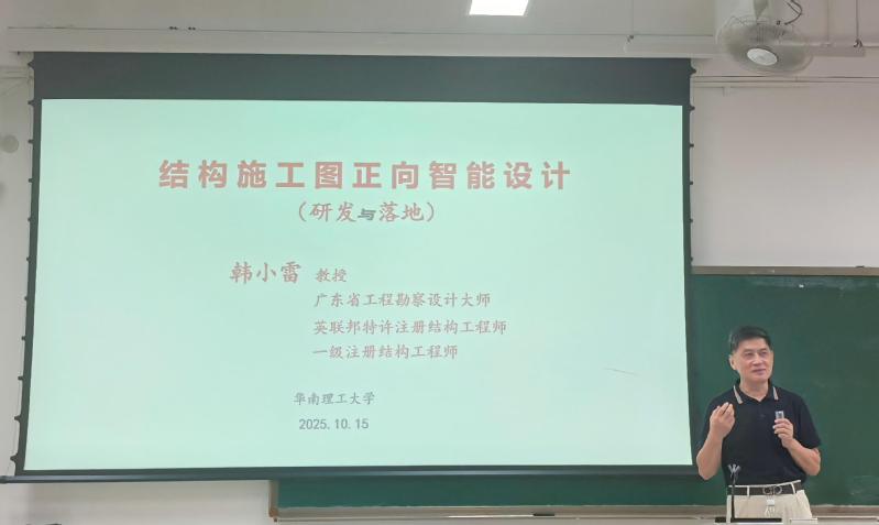 本网讯(记者 熊逸丰)10月15日下午,土木工程学院在A5-202隆重举办“砼筑未来”系列讲座——“结构施工图正向智能设计”,特邀华南理工大学教授韩小雷担任主讲,2023级土木工程及智能建造专业、2025级专升本学生参与学习,现场互动热烈,学术氛围浓厚。