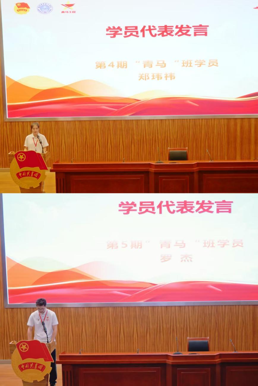 随后,第4期、第5期青马班学生代表依次上台发言。第4期青马班优秀学员代表郑玮祎分享了自己在青马班一年的成长经历,在志愿服务、社会实践等活动中,真正体会到将理论与实践紧密结合的重要性。第5期青马班学生代表罗杰则表达了自己能够加入青马班的自豪与荣幸,他承诺,将以优秀青马学员为榜样,认真学习理论知识,勇担时代重任,努力成长为政治坚定、本领过硬的青年马克思主义者。