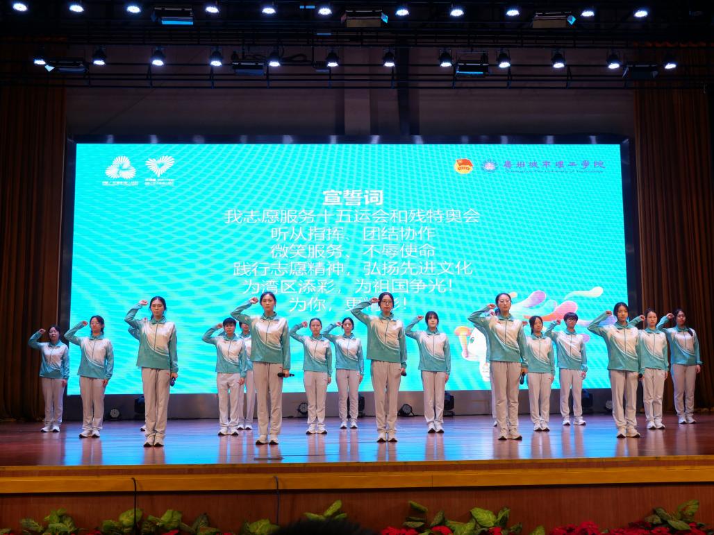 “我志愿服务十五运会和残特奥会……”志愿者代表上台领誓,全体志愿者起立宣誓,神态庄严,态度坚定,声音洪亮,展示广州城理“小海豚”服务“十五运会和残特奥会”的决心。