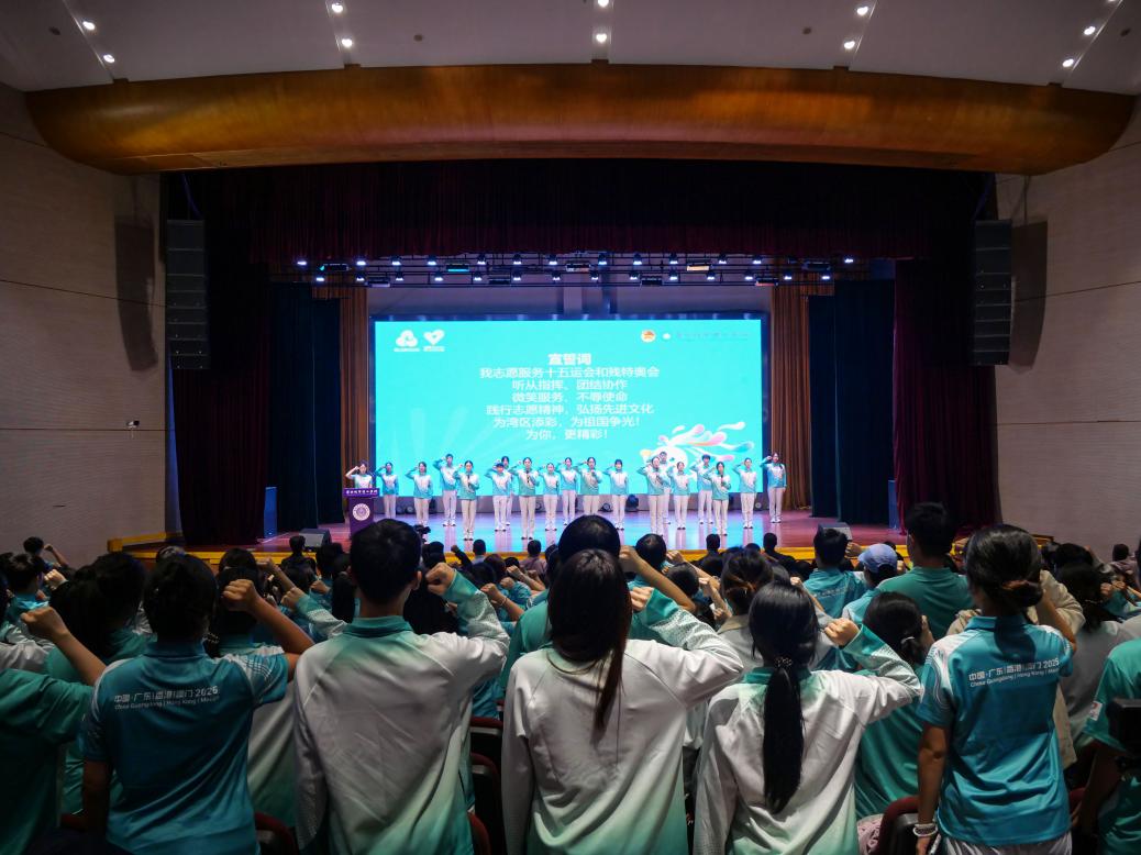 经过前期系统的通识培训,上岗服务等,我校志愿者已做好充分准备。电子信息工程学院/通信工程学院2022级陈董秦同学作志愿者代表发言,他回顾前期在白云机场进行的抵离服务,让他懂得了志愿者肩上的责任,志愿者的言行举止关乎赛会的整体形象,志愿者的服务质量影响着参赛人员的赛事体验。他代表全体“广州城理小海豚”承诺做到“坚守初心、牢记使命;精益求精,专业服务;团结协作,众志成城;展现风采,传递友爱。”