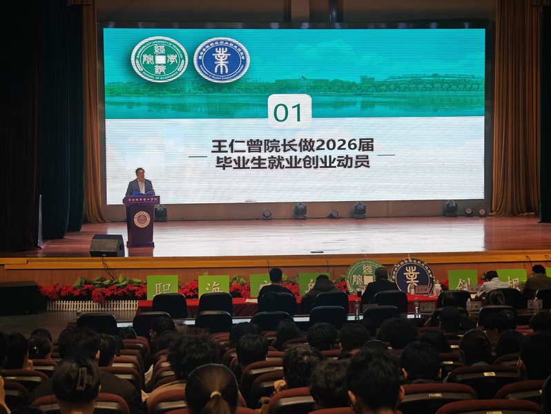 大会伊始,王仁曾致辞。他深刻剖析了新时代下的就业创业机遇与挑战,指出经济学院学子应充分发挥专业优势,敢于拥抱变化、勇于开拓创新。他强调,学院将始终与同学们并肩同行,全力以赴为有志于就业创业的同学搭建优质平台、整合丰富资源。一方面,学院将积极与各类企业、机构建立深度合作关系,拓展实习和就业渠道,为同学们提供更多接触行业前沿、积累实践经验的机会;另一方面,学院将组织系列创业培训和指导活动,邀请行业专家和成功创业者分享经验,为同学们的创业之路提供全方位的支持和保障。