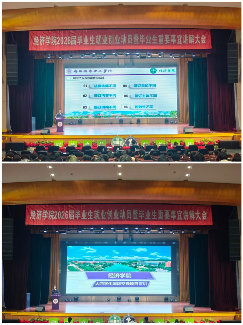 经济学院就业创业辅导员毛锦淇就毕业生离校前需重点关注的系列事宜进行了系统梳理与讲解,内容涵盖毕业资格审查流程、就业协议签订规范、档案户籍转接注意事项以及各类就业政策的时间节点。国际交流中心江雨舟详细介绍了我校与海外知名院校合作的各类留学项目,包括项目独特优势、申请条件、奖学金政策及语言要求等核心信息,为有意向深造的同学们提供了权威、全面的国际化教育资讯,为学子们规划多元化未来发展打开了新的窗口。
