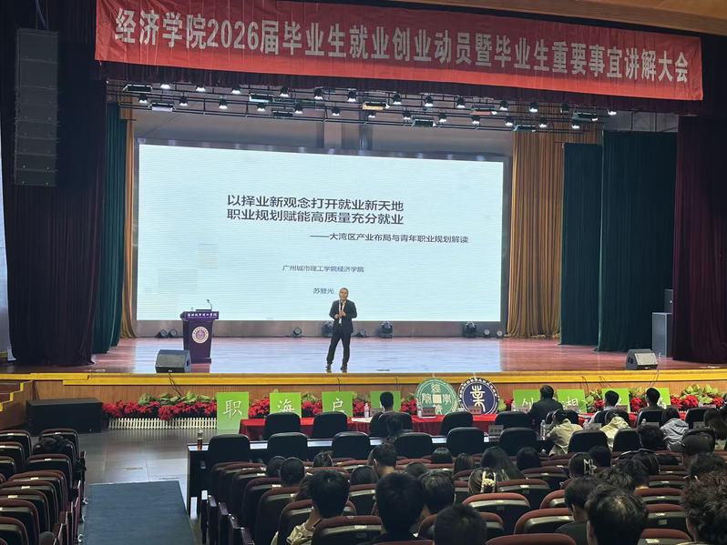 随后,苏登光以“以择业新观念打开就业新天地——大湾区产业布局与大学生职业规划”为题,为同学们带来了一场内容丰富、案例生动的职业规划讲座。他结合自身创业经历与企业管理智慧,深入剖析了大湾区产业布局的独特性与发展脉络。他指出,大湾区的产业布局并非孤立存在,而是相互关联、协同发展的有机整体。这种布局为大学生提供了多元化的就业选择和广阔的职业发展空间。苏登光通过详实的数据和鲜活的实例,为同学们勾勒出一幅清晰的大湾区产业地图。他鼓励同学们要深入了解大湾区的产业布局,结合自身专业和兴趣,找准职业定位,以择业新观念打开就业新天地。