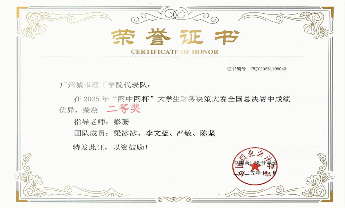 本网讯(记者 彭珊 黄凤娟)11月8日,第十三届“网中网杯”全国大学生财务决策大赛全国总决赛落下帷幕。我校国际商学院教师彭珊指导的学生团队表现亮眼,从全国众多参赛队伍中脱颖而出,最终斩获全国总决赛二等奖,充分展现了我校学子的过硬专业素养与实践能力。