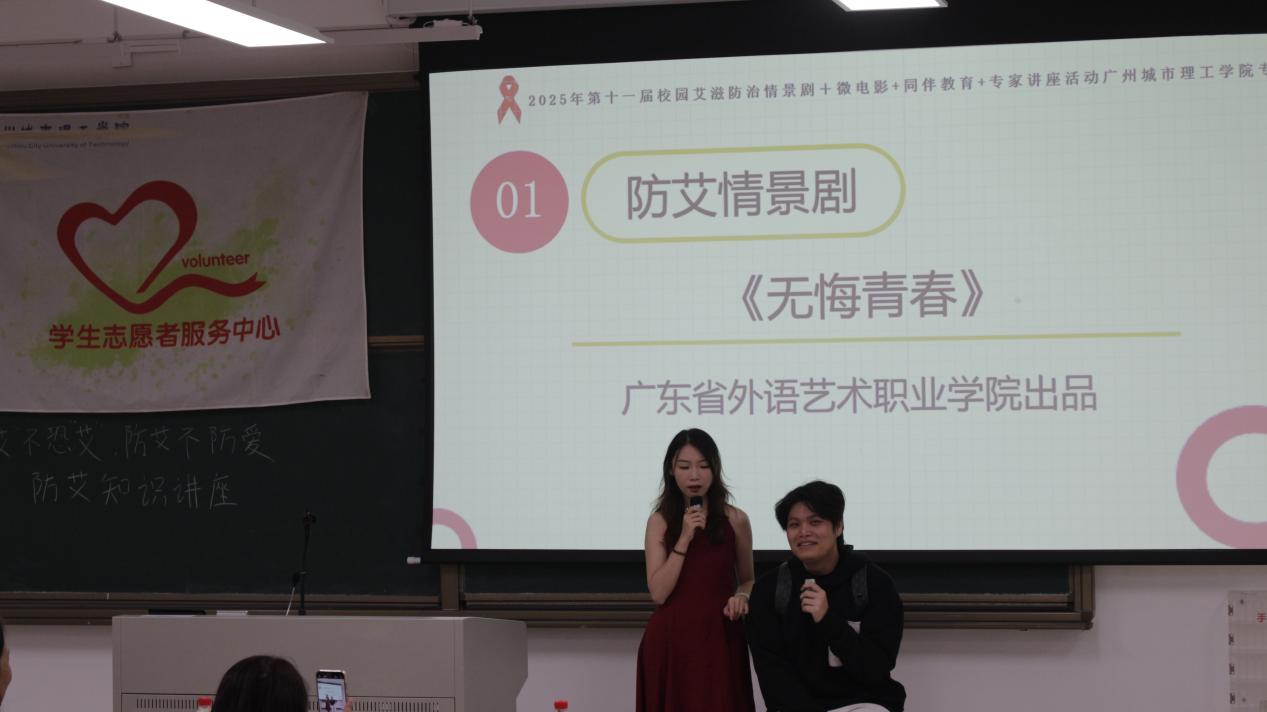 本网讯(记者 赵悦彤)为筑牢校园健康防线,普及艾滋病防治知识与性健康理念,11月13日,由广州市疾病预防控制中心主办,广东省外语艺术职业学院、花都区疾病预防控制中心联合校团委学生志愿者服务中心承办的“校园艾滋病防治情景剧+专题讲座+同伴教育”宣讲活动在A5-101室举行。此次活动以融合知识传播与互动体验的多元形式,共吸引430余名同学积极参加,为大学生群体的青春健康保驾护航。