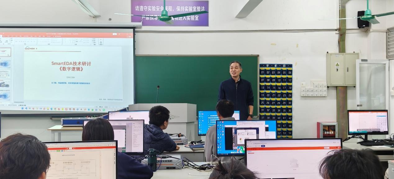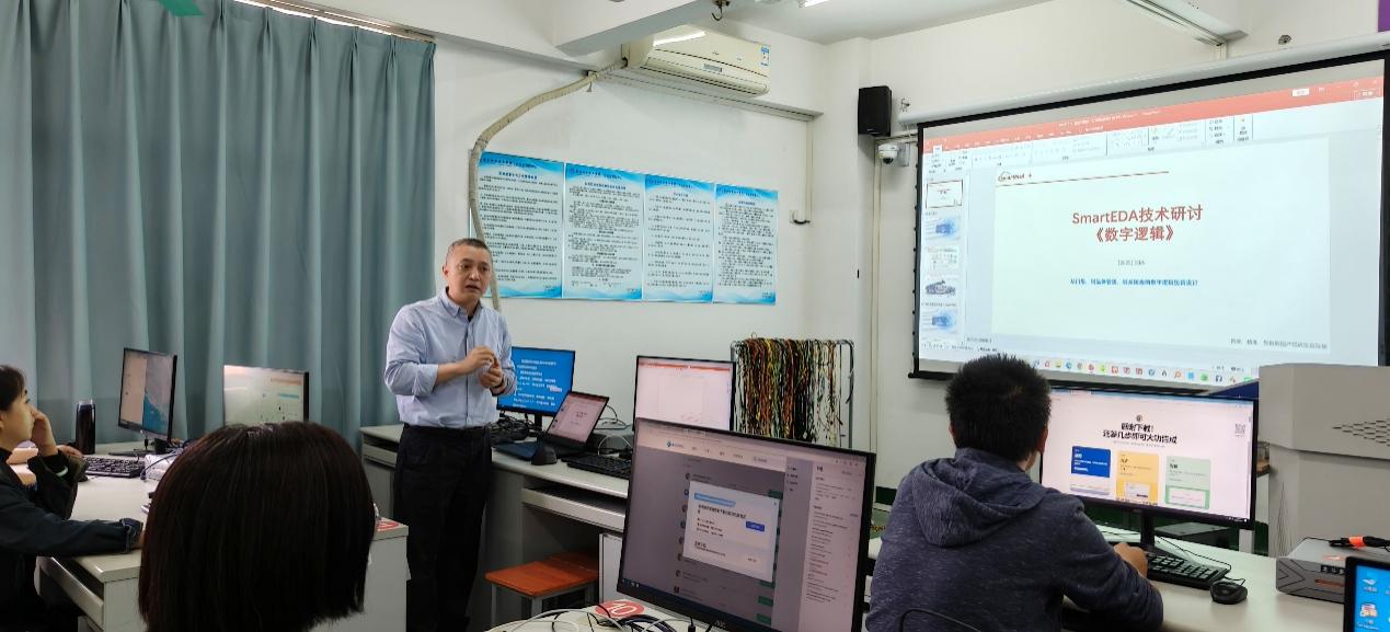 在技术培训环节,达客智数(广州)科技有限公司技术部负责人李明为在场教师进行了系统讲解和实操演示。他详细介绍了SmartEDA平台的基本功能、操作流程及教学应用场景,并通过典型电路案例,现场演示了软件在电路分析、数字与模拟电路设计等方面的仿真效果。为确保培训效果,学院前期已为所有参训教师开通了软件账号,教师们使用个人手机号即可直接登录系统进行实操练习。
