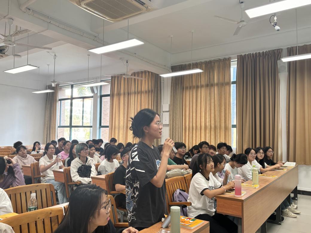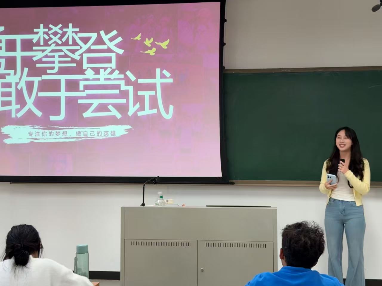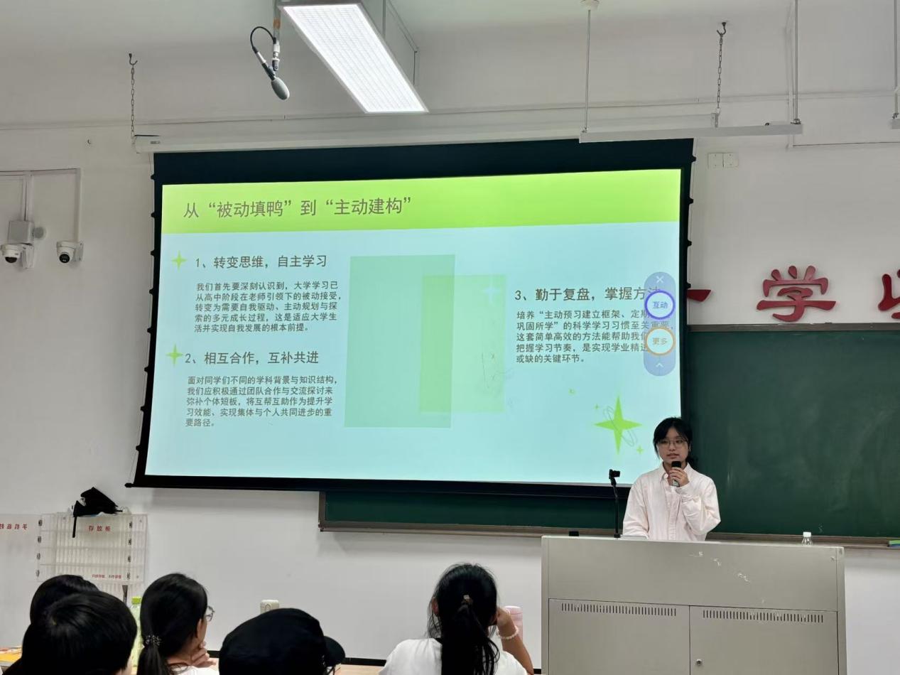 张梦珂在分享中以自身经历切入,坦言曾从初入校园的懵懂迷茫,到在尝试与反思中走向目标清晰,强调大学是自我探索与提升的关键阶段,需找准方向、脚踏实地。她围绕学业、竞赛、实践进行分享,学业是大学生涯的基石,她认为大学学习更重自主探索与自我驱动,主动查漏补缺、养成良好习惯,以持续积累筑牢根基。她鼓励大家积极参加竞赛,并分享了自己从挑战杯宣讲员成长为团队负责人的经历,强调竞赛能锤炼团队协作、问题解决等能力。她还提出要主动参加实习,有效打破“未知焦虑”,在实践中结合理论认清行业逻辑,并思考自身兴趣与职业方向。
