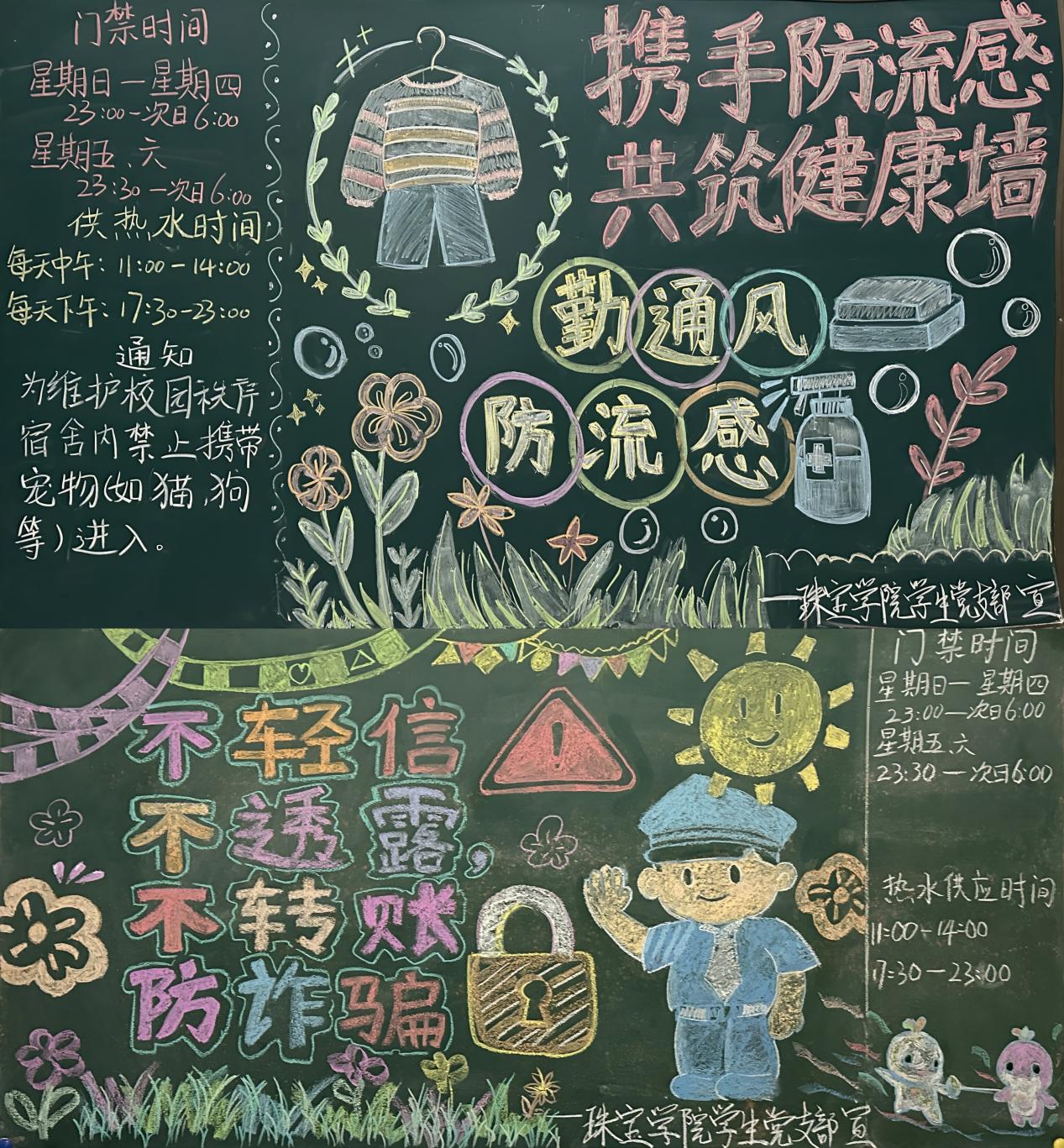 学院学生党支部充分发挥先锋模范作用,在C9、C15宿舍楼下绘制主题板报,内容涵盖三大核心板块。防流感板块以“携手防流感 共筑健康墙”为主题,提醒学生“勤通风、防流感”,保持个人卫生;防诈骗板块围绕“不轻信、不透露、不转账、防诈骗”核心原则,揭露常见校园诈骗套路,强化学生反诈警惕性;宿舍管理板块则清晰标注门禁时间、供热水时间及宿舍禁养宠物等规定,让宿舍管理规范直观可见。