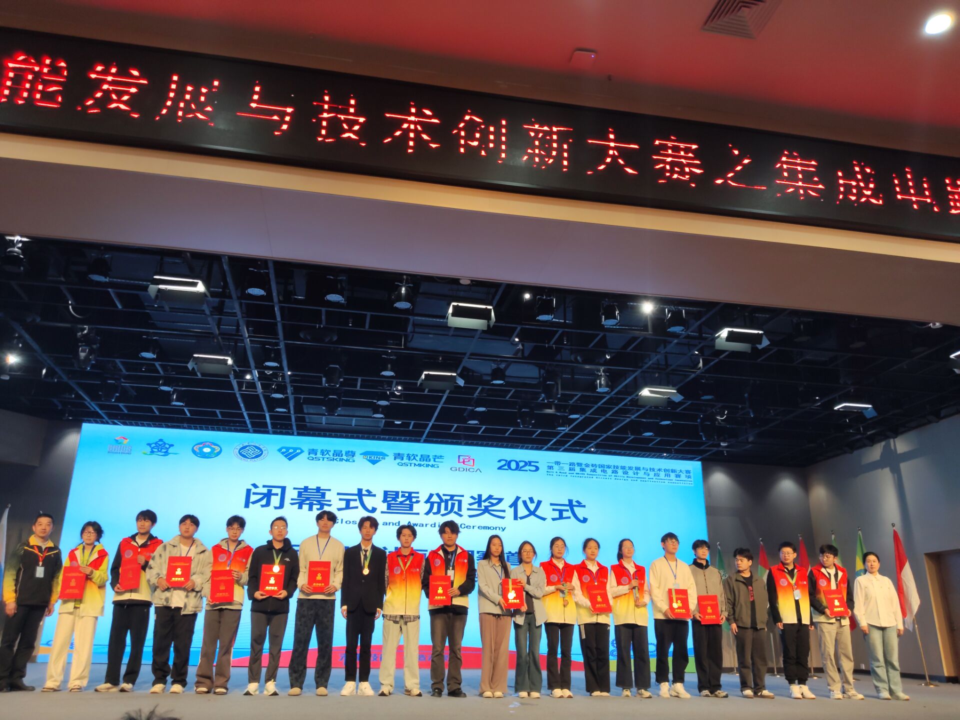 本网讯(记者 董萌 郭敬荣)11月28日至29日,2025年“一带一路暨金砖国家技能发展与技术创新大赛”——第三届集成电路设计与应用赛项全国总决赛在广州职业技术学院(高明校区)举行。我校四支参赛队伍凭借扎实的专业功底、创新的技术方案和默契的团队协作,在全国众多高校学子的同台竞技中脱颖而出,斩获FPGA本科组一等奖一项、三等奖一项,IC设计与应用本科组优秀奖两项,充分展现了我校在集成电路领域的教学实力与人才培养成果。