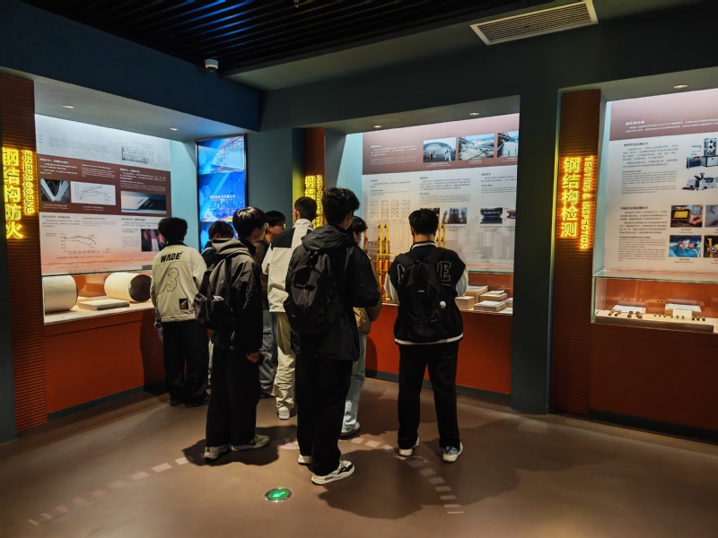 在博物馆的一角,3×3米电液伺服振动台可模拟8度罕遇地震。1:20高层钢模型选配黏滞阻尼器、调谐质量阻尼器(TMD)和防屈曲支撑(BRB)。随着台面剧烈晃动,振幅数据实时投射到LED屏。学生操控着振动台,现场体验了抗振过程中模拟钢结构的振动幅度,了解了结构不同受力状态的情形,对专业的认识有了进一步的理解。