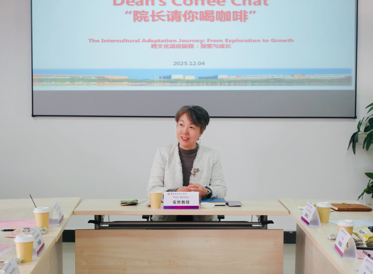 本网讯(记者 龙鹏骏 王一旭)12月4日下午,国际商学院在A6-308举办本学期第4场“院长请你喝咖啡”主题交流活动。本次活动以“跨文化适应旅程:探索与成长”为主题,5名来自柬埔寨的国际学生与5名中国学生代表共聚一堂,在氤氲咖啡香中用英文分享跨文化适应体验,共话成长感悟。国际商学院院长安然教授不仅亲自策划并全程参与,更以她独特的亲和力和专业视角,将活动升华为深度跨文化对话的典范。党总支副书记梁伟滔、国际学生的辅导员和班主任以及国际交流与合作处相关老师参加了活动。活动由安然教授主持。