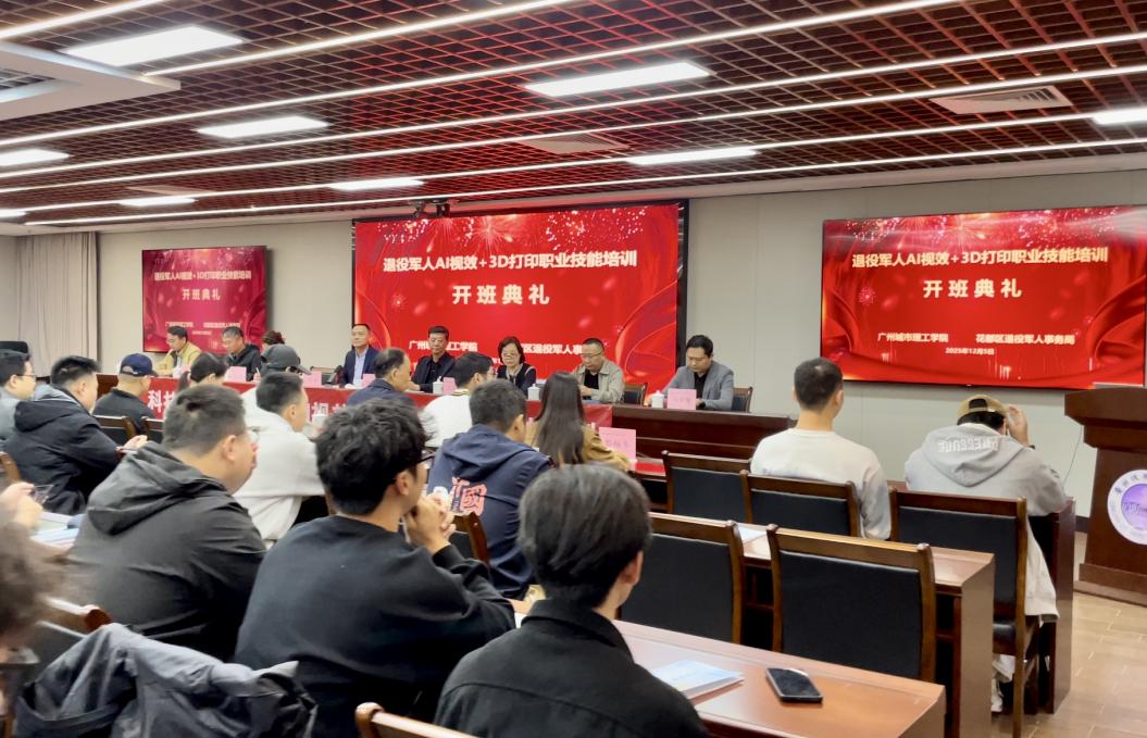 本网讯(记者 王磊)为深入落实国家退役军人就业创业扶持政策,破解退役军人转型期技能短板难题,12月5日至7日,我校工程研究院与花都区退役军人事务局联合举办“AI视效+3D打印职业技能培训班”,为59名退役军人学员提供前沿性的技能赋能。此次培训是一次校地协同服务退役军人提高技能高质量就业的有益实践。学校党委书记杜小明、花都区退役军人事务局党组书记、局长周扁、学校工程研究院院长马乐、广州哈里模创科技公司经理李忠华、中睿星弘有限公司总经理马宇灏及相关领导、企业代表出席开班典礼。