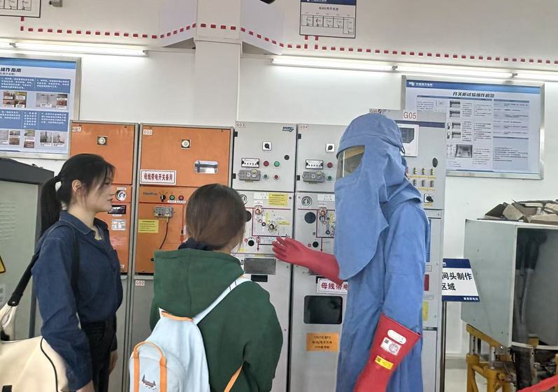 在模拟演练环节,学生身着防护服,完成“模拟带电环境下设备状态检查-操作指令确认-倒闸操作执行-应急故障排查”全流程演练,同步记录操作难点与应急处置方法,并现场拍摄设备测试图片,进一步丰富了研究与训练素材,也有效促进了理论知识与实践应用的深度融合。
