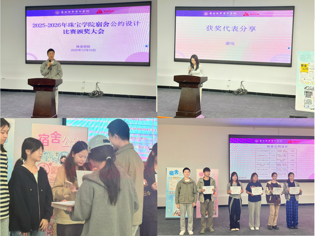 本网讯(记者 李运成 关咏仪 杨唯炜)12月10日,珠宝学院宿舍公约设计比赛颁奖大会于A7-101举行。本次活动聚焦“淬珠宝光华,筑宿舍雅约”主题,表彰在宿舍公约设计中展现创意与责任感的宿舍集体,以榜样力量推动宿舍文明建设向更具温度与秩序的方向发展。