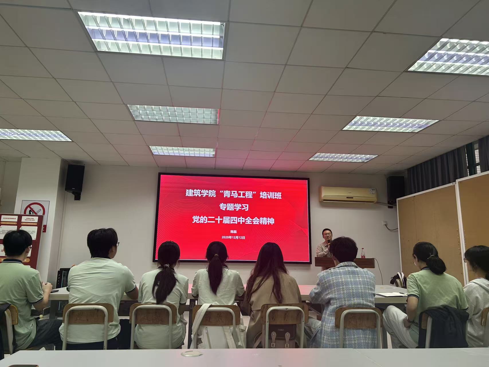 本网讯(记者 聂靖雯 吴有权)12月12日下午,建筑学院在A10一楼评图厅组织学院“青马工程”培训班专题学习党的二十届四中全会精神。学院书记陈磊进行宣讲,学院团委负责人和全体青马班学员参加学习。