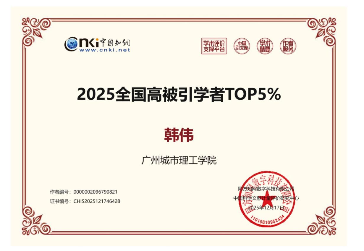 本网讯(记者 郭韵焓)12月17日,中国知网·中国科学文献计量评价研究中心遴选出了“2025全国高被引学者”名单,该名单旨在客观、科学衡量并表彰近十年来国内科研成果丰富、学术影响力杰出的学者群体,彰显其对我国教育科研与学科发展的贡献。其中,我校机械工程学院/机器人工程学院工程训练中心主任韩伟入选“2025全国高被引学者Top5%”。