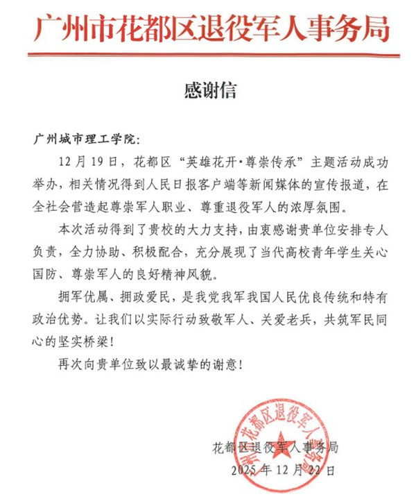 本网讯(记者 甄诚)12月22日,我校收到一封来自广州市花都区退役军人事务局的感谢信。信中对我校在12月19日“英雄花开·尊崇传承”双拥主题活动中给予的大力支持致以诚挚谢意。这份满载认可的感谢信,既是对我校师生积极参与双拥工作的高度赞誉,更是对学校深耕国防教育、厚植家国情怀育人成效的充分肯定。