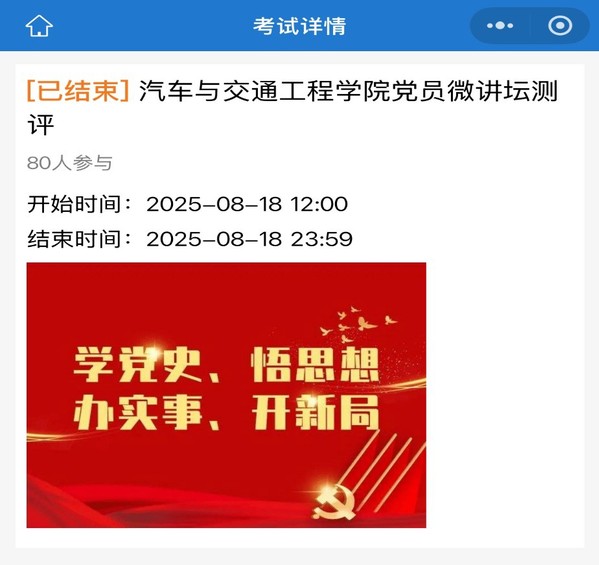 党员微讲坛是汽车与交通工程学院党史学习教育常态化的特色品牌,已成为青年学子知史爱党、知史爱国的重要阵地。此次抗战主题系列微讲坛,不仅带领青年党员、入党积极分子重温了中华民族救亡图存、抵御外敌的壮阔史诗,更让爱国情怀与责任担当深深扎根在大家心里。学院将持续深耕红色教育阵地,以伟大抗战精神激励学子勇担使命,在新征程上续写民族复兴伟业的新篇章。