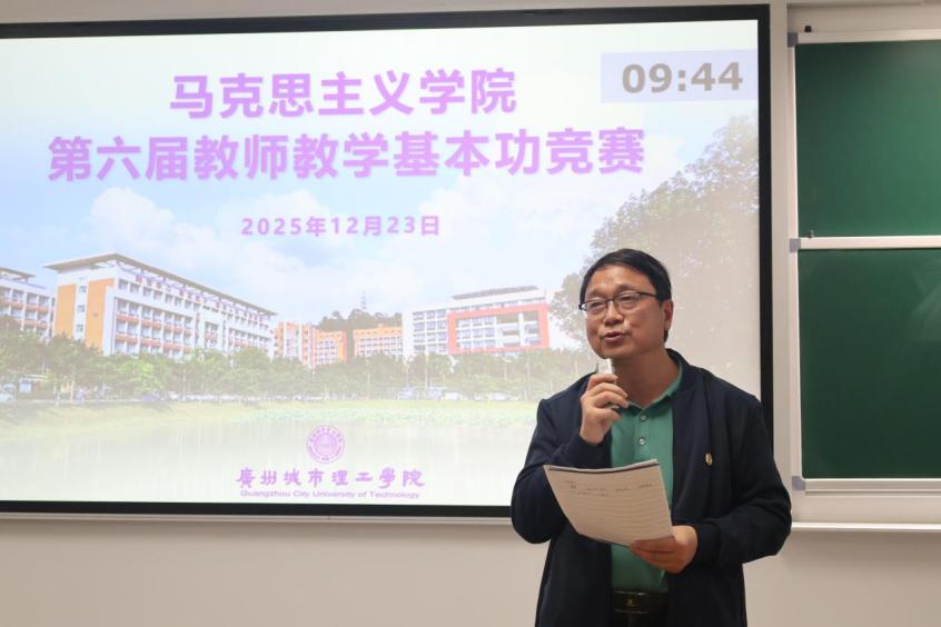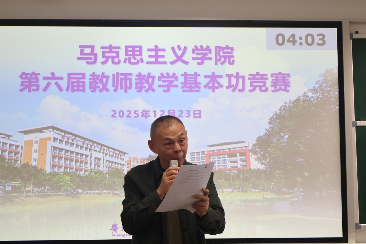 本网讯(记者 马忆)12月23日,马克思主义学院第六届教师教学基本功竞赛在A12-510教室举办。本次竞赛聚焦思政课教学质量提升与教学方法创新,旨在以赛促教、以赛促研,锻造一支政治强、情怀深、思维新、视野广、自律严、人格正的思政课教师队伍。我校马克思主义学院副院长王文彦主持竞赛,易钢、杜奋根、杨明、邢增銮、周静等多位兄弟院校马克思主义学院院长莅临指导,并与学院教授担任竞赛评委,学院全体教师观摩学习。