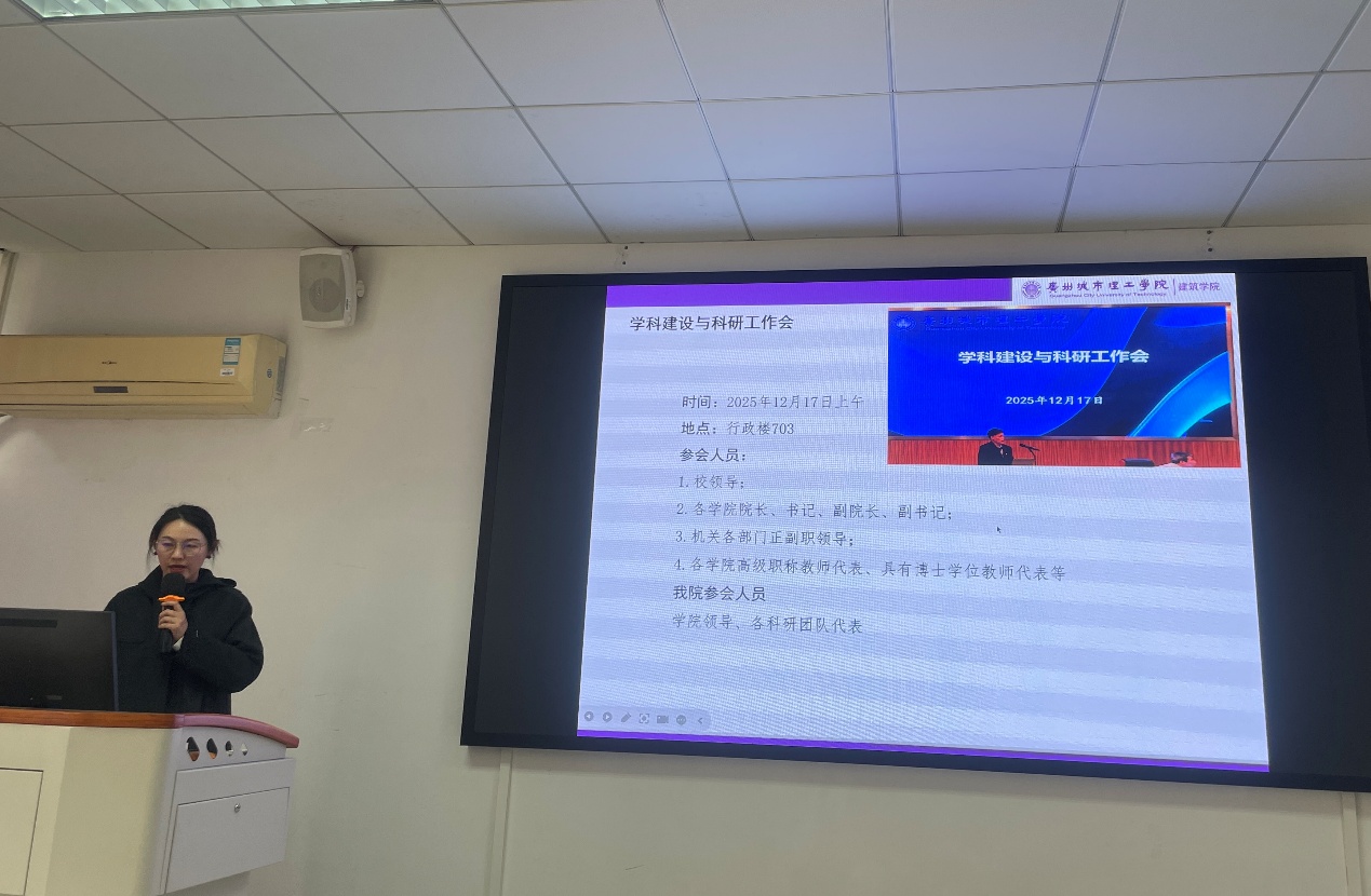 建筑设计教研室主任田亚男汇报了学校学科建设与科研工作会议精神,传达了学校下一阶段学科建设以及科研工作的主要任务、重要举措等内容。陈磊传达了学校招生就业工作会议精神,总结了学院2025年招生就业工作成绩,分析了2026年的挑战与机遇,并对2026年招生就业工作进行了具体部署。