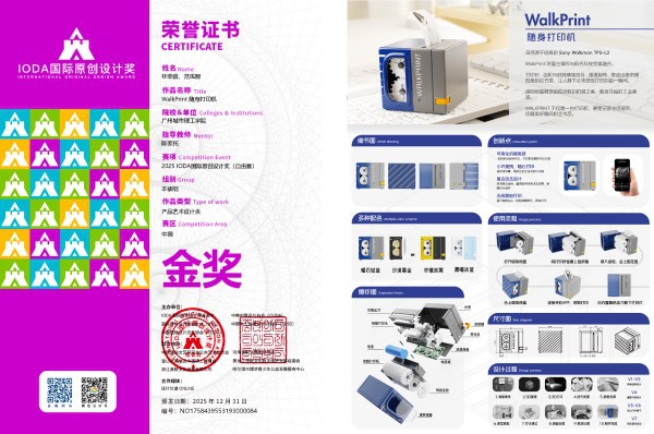 由陈家托老师指导,林荣鑫、范成智同学团队设计的作品《WalkPrint随身打印机》同样斩获产品艺术设计类国赛金奖。该作品灵感源于经典Sony Walkman,将复古情怀与现代打印科技巧妙融合。设计通过透明视窗展现齿轮运转的机械之美,营造出磁带播放般的仪式感,旨在让用户在快节奏生活中重拾记录的乐趣,被誉为“珍藏美好瞬间的艺术品”。