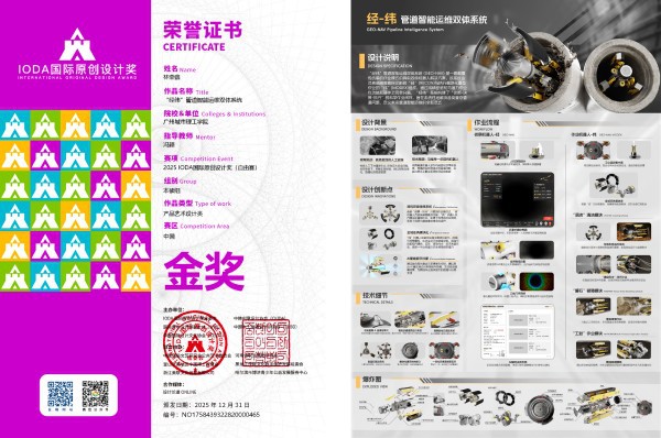 本届大赛中,由冯颖老师指导,林荣鑫同学设计的作品《“经纬”管道智能运维双体系统》凭借前瞻性的设计理念,荣获产品艺术设计类国赛金奖。该作品聚焦城市地下基础设施维护痛点,创新性地构建了“侦察-执行”异构双体协同作业模式,通过“诊断-决策-执行”的科学闭环,为城市生命线的智能化运维提供了系统性的解决方案。