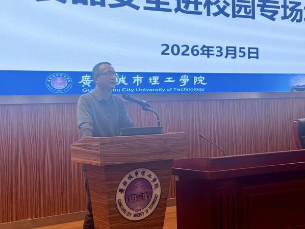 本网讯(记者 李荣邦 林雯洁)为严防严控校园食品安全风险,切实提升学校餐饮从业人员专业素养与风险防控能力,3月5日下午,花都区市场监督管理局在学校行政楼703报告厅举办校园食品安全专场培训。花都区市场监督管理局四级高级主办李明,秀全街道经济发展办公室,秀全市场监督管理所相关负责人一行6人,后勤处膳食管理科、物业管理科以及学校食堂、餐厅、商铺共计165名餐饮从业人员参加了本次培训。副校长尚启超出席会议并讲话。