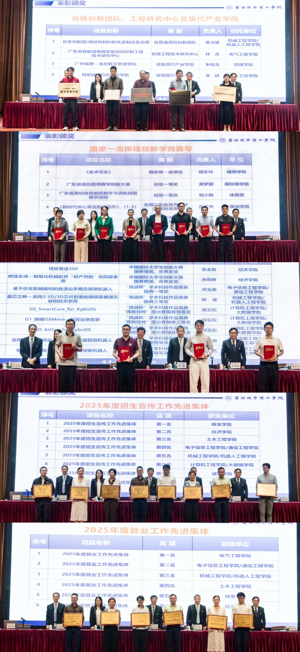 会上,对省级创新团队、工程研究中心及现代产业学院,省级优秀教学成果奖,中国国际大学生创新大赛及“挑战杯”学术科技竞赛,2025年度招生宣传工作先进集体,2025年度就业创业工作先进集体等获奖单位及个人进行了表彰颁奖。