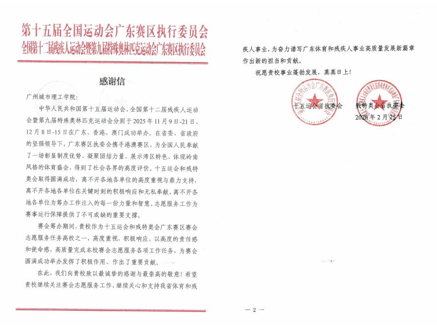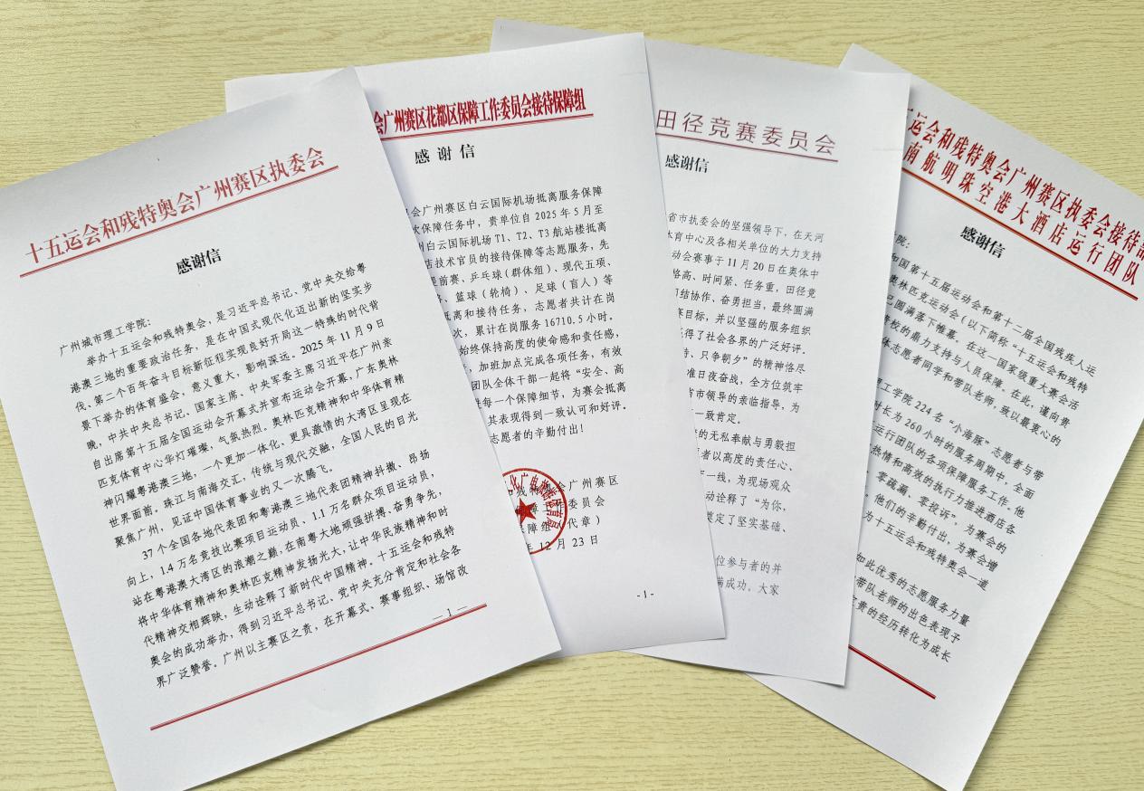 本网讯(记者 周梦思)近日,我校先后收到十五运会和残特奥会广东省执委会、广州赛区执委会、花都区保障工作委员会、田径竞赛委员会、广州南航明珠空港大酒店运行团队等多方发来的感谢信,信中对我校高度重视、积极响应,高质量完成赛会志愿服务工作,为赛事圆满成功作出的重要贡献表示充分肯定与诚挚感谢。