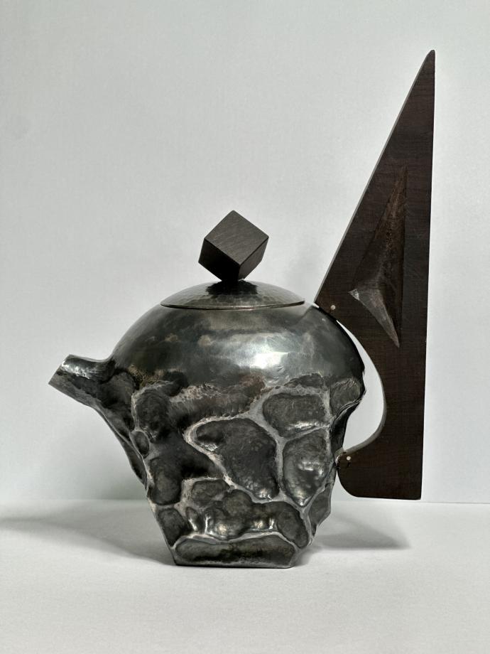 手作银壶云水方心系列,《云影石韵》壶身银面以手工细抛,呈现镜面般的云影流动。中腹以下,黑檀保留粗犷锤痕,仿佛石壁风化。细腻与粗粝的骤变,让每一次触碰都像一次跨越千年的对话。壶体取满月之圆,包容含蓄。把手化三角之锋,挺拔利落。圆与方、柔与刚、静与动,在同一器物中形成微妙张力,既稳若磐石,又欲破空而去。将“自然天成”与“匠心独运”凝于一壶,以当代设计语言重新诠释非遗锻银技艺,让东方器用美学回归日常。