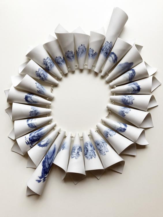 作品《山山而川》为青花陶瓷项饰,以非遗传统青花陶瓷技艺为工艺基础,结合黄山“奇峰聚、云雾绕”的自然意境,在传承注浆成型、青花绘制等非遗技艺基础上,通过超薄瓷片工艺突破,实现“非遗美学”与“现代佩戴”的文化衔接。其核心价值在于“非遗文化的活态传承”,0.1cm超薄瓷片工艺突破是对非遗“精益求精”工匠精神的延续,青花绘山川则将传统陶瓷“寄情山水”文化基因融入当代设计,让佩戴者日常触摸非遗温度,实现“让非遗走出博物馆,走进生活”的文化传播意义。