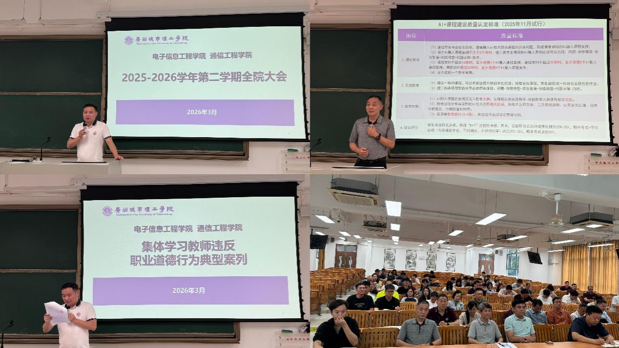 本网讯(记者 王婧 陈少玲)3月24日,电子信息工程学院/通信工程学院在A5-201室召开了2025-2026学年第二学期全院大会。会议传达学校高质量发展部署,系统安排新学期重点任务,强化师德师风建设,凝聚全院共识,共绘学院高质量发展新蓝图。会议由学院党总支常务副书记罗自力主持,全院教职工出席。