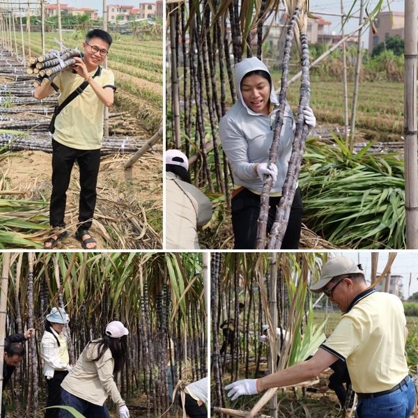 得知蔗农困境后,经济学院迅速响应,第一时间与雁沙村村委对接,敲定采购方案。活动当天清晨,学院教工代表组成的助农小分队已抵达蔗田,大家头戴草帽、挽起衣袖,在农户指导下分工协作,弯腰砍蔗、削叶去根、捆扎搬运,动作娴熟而高效。经过一上午的奋战,1800根饱满粗壮的甘蔗全部采收完毕并装车运回学院。