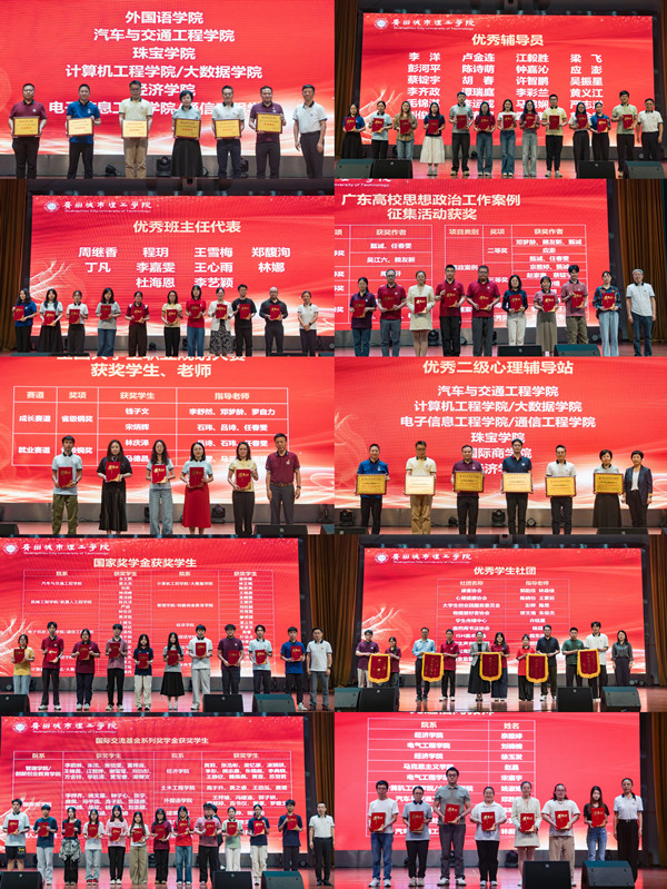 榜样引领前行,荣光激励奋进。大会举行隆重的颁奖仪式,校领导及相关部门负责人依次登台,为国家奖学金、国家励志奖学金获得者、综合测评先进个人与班集体、优秀班主任、优秀辅导员、学风建设先进集体与个人、优秀二级心理辅导站、招生就业先进集体等一大批先进典型颁奖。掌声雷动、荣光闪耀,每一份荣誉都凝聚着师生的辛勤耕耘与不懈拼搏,充分展现了广州城理人追求卓越、勇毅前行的精神风貌。