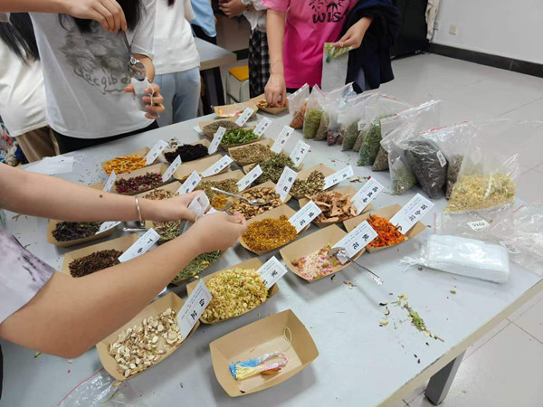 活动现场,绣布、丝线、流苏、艾草、薄荷、薰衣草、陈皮等材料依次铺开,空气中弥漫着淡淡的草本香气。活动伊始,工作人员先讲述了香囊的历史渊源与文化意蕴,并分享了常见香料的特性与搭配巧思,让同学们在动手之前先对这份“随身携带的香气”有了更深的理解。