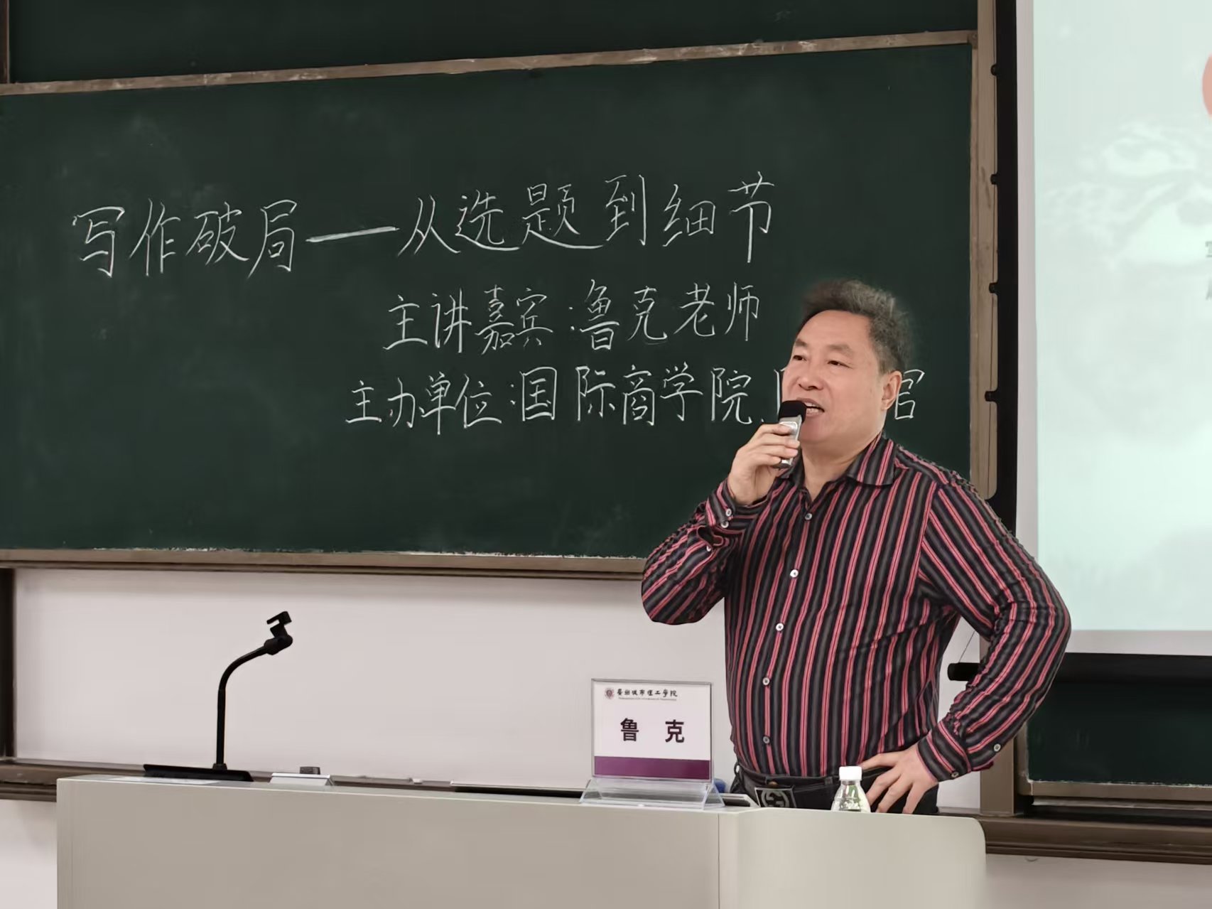 本网讯(记者 伍尚斌 黄增光)为深化美育浸润行动,培育具有全球胜任力的应用型人才,3月30日,国际商学院与图书馆于A5-201教室联合举办“写作破局——从选题到细节”专题讲座。本次活动特邀著名作家、诗人鲁克主讲,学校师生280余人参与,现场互动热烈、反响良好。