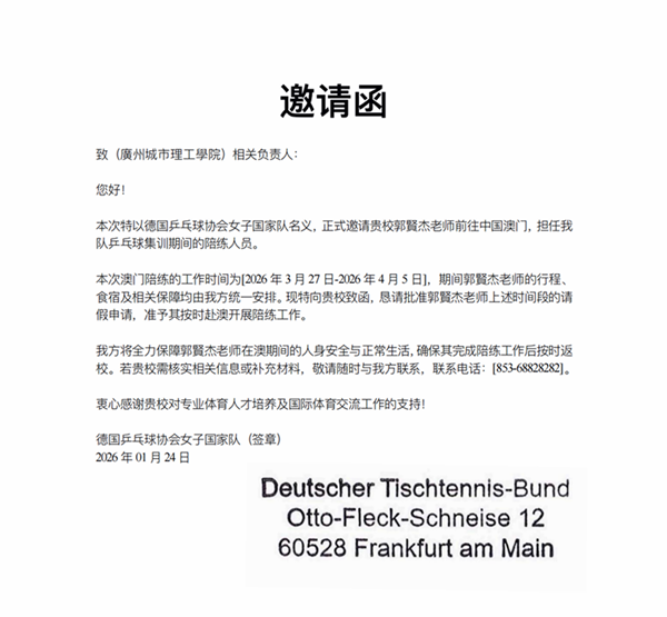 郭贤杰自幼接受乒乓球专业训练,在运动员时期曾斩获多项重量级赛事荣誉,包括印度尼西亚公开赛男子团体冠军及单打冠军、全国大学生乒乓球锦标赛男子单打冠军等。入职我校体育部后,郭贤杰将丰富的实战经验融入体育教学与训练,深受学生喜爱。此次受德国国家队特邀赴澳门担任世界杯陪练,充分彰显了我校体育教师的专业水准与个人竞技实力,也为学校赢得了广泛的声誉。
