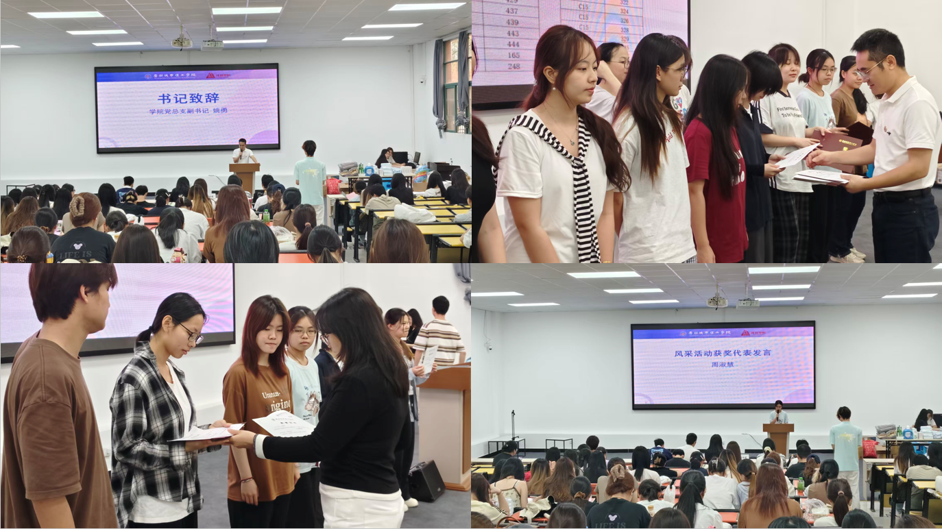 颁奖大会现场,姚勇为大会致开幕词。他向所有获奖集体与个人致以热烈的祝贺,充分肯定了本届宿舍文化节的育人成效与同学们的参与热情,强调宿舍是学生在校期间最温暖的“第二个家”,是涵养品格、共同进步的重要成长驿站,希望受表彰的集体与个人珍惜荣誉、再接再厉,充分发挥榜样示范作用,带动全院同学共同打造整洁有序、友爱和谐、勤学善思的宿舍成长乐园。随后,优秀文明宿舍代表温盈盈、宿舍风采活动代表周淑慧依次上台,分享了宿舍管理、文化建设中的实践经验与成长感悟。在颁奖环节,与会教师分别为优秀文明宿舍、宿舍一角书签制作比赛、宿舍AI卡通合影比赛的获奖代表颁发荣誉证书,现场掌声不断,氛围热烈。大会最后,全体获奖人员与到场师生合影留念,本届宿舍文化节颁奖大会圆满落下帷幕。