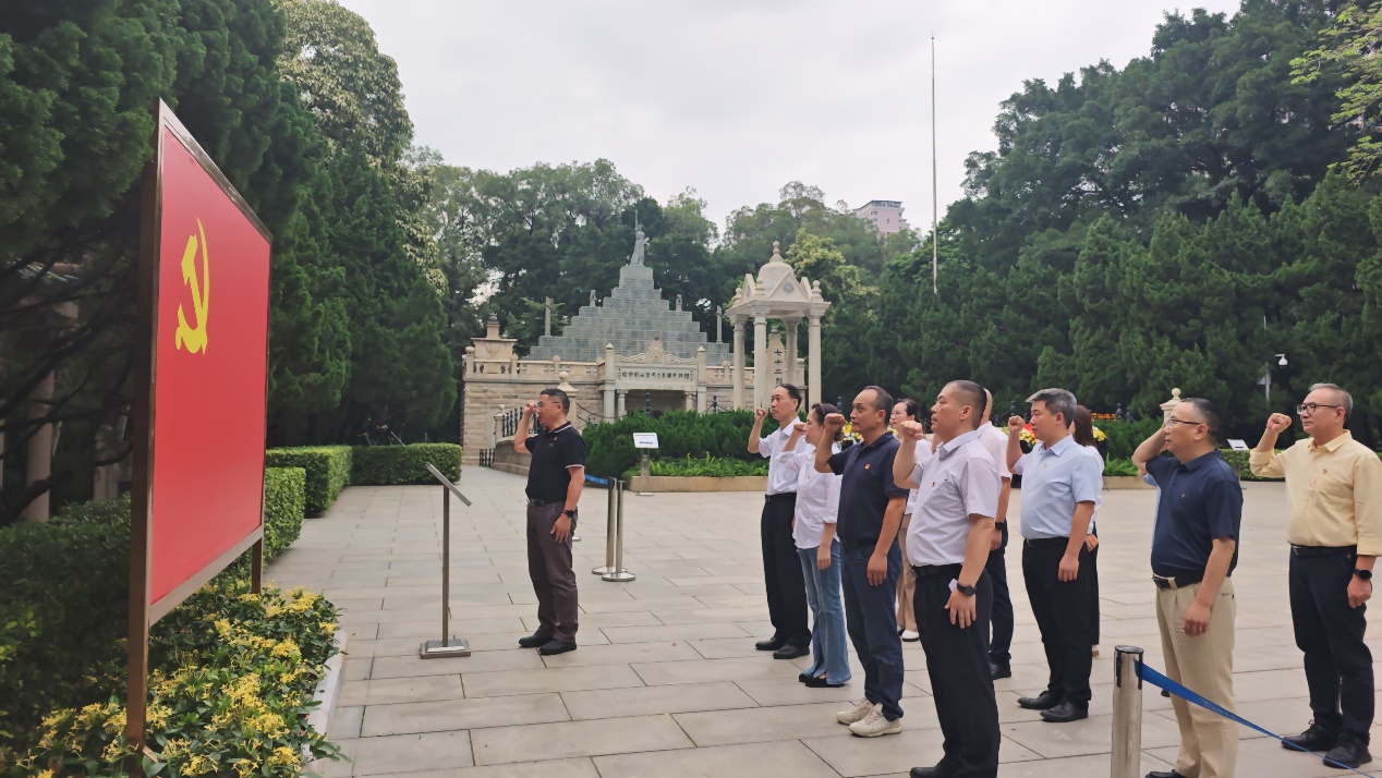 业务交流结束后,全体同志在孙中山手书的“浩气长存”牌坊前追溯黄花岗起义历史,在七十二烈士墓前整齐列队,默哀肃立。郑钦与马乐代表全体党员敬献花圈,整理缎带,全体同志行三鞠躬礼,敬献鲜花,深切缅怀革命先烈;随后全体党员面向党旗,重温入党誓词,进一步坚定理想信念、强化责任担当。