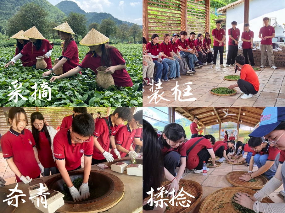 在采茶制茶研学实践与劳动教育环节,全体成员化身“茶农”,头戴竹帽、身挎茶篮走进茶园,认真学习一芽一叶的采摘规范,亲手采摘鲜嫩茶青。采摘结束后,大家在制茶车间依次体验采茶、杀青、揉捻、干燥四大核心工序,亲手感受茶叶从鲜叶到成茶的蜕变过程,在动手实践中体会劳动的艰辛与收获,深刻领悟非遗技艺背后的匠心精神。