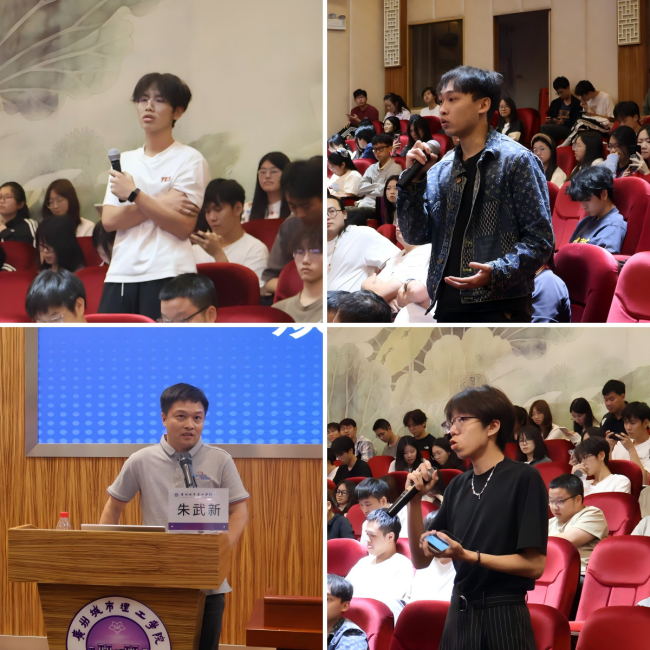 讲座中,朱武新围绕求学时光、职场历练与创业征程等内容展开分享。他结合自身从职场新人到制造行业创业者的成长经历,以“迷茫、实干、坚持”三个关键词概括其职业蜕变过程。他讲述了自己从一名普通助理做起,利用空余时间钻研设备工艺,走访多家供应链工厂,最终掌握核心技术并组建团队创业的历程。他坦言,初入职场时曾对未来方向感到迷茫,但正是在基层岗位上的扎实积累与持续学习,使他逐步找到了创业突破口。他强调,应以实干为根基,坚持“做中学、学中做”。同时,他还提出“跨界破局”的思维理念,鼓励同学们打破专业与行业的思维定式,勇于尝试新赛道与新技术。最后,他给出三点建议,突出“先就业、再择业”、实干精神与坚持态度的重要性。在互动环节,他结合自身创业经历,就团队组建、核心竞争力培育、创业避坑策略及跨专业创业路径等问题为同学们答疑解惑,现场交流气氛热烈。