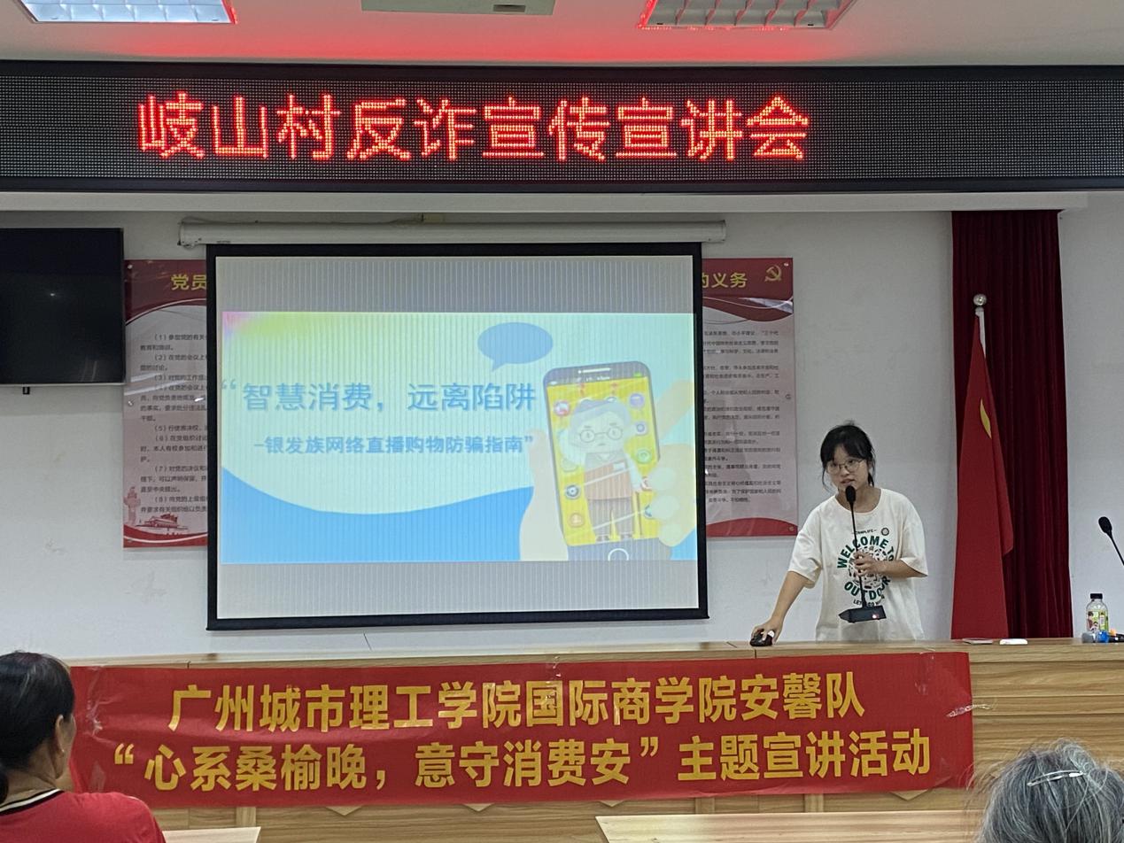 Team “Anxin” (meaning reassurance and warmth in Chinese) from the International Business School of Guangzhou City University of Technology (GCUT) held two lectures themed on “caring for senior citizens through guaranteeing safety of their livestreaming shopping” in Huagang Community and Qishan Village in cooperation with “Double-Hundred Project” Service Station for Social Work of Xiuquan Street, Huadu District, Guangzhou City. Rooted in villages, communities and nursing homes, Team “Anxin” has held four series of lectures so far. Consistent with the Outline Development Plan for the Expanding Domestic Demand (2022-2035) of the 14th Five-Year Plan (2021-2025), the activity aims to enhance senior citizens’ awareness of safety and confidence in online shopping, thus helping to promote the healthy and sustainable development of livestreaming e-commerce industry.