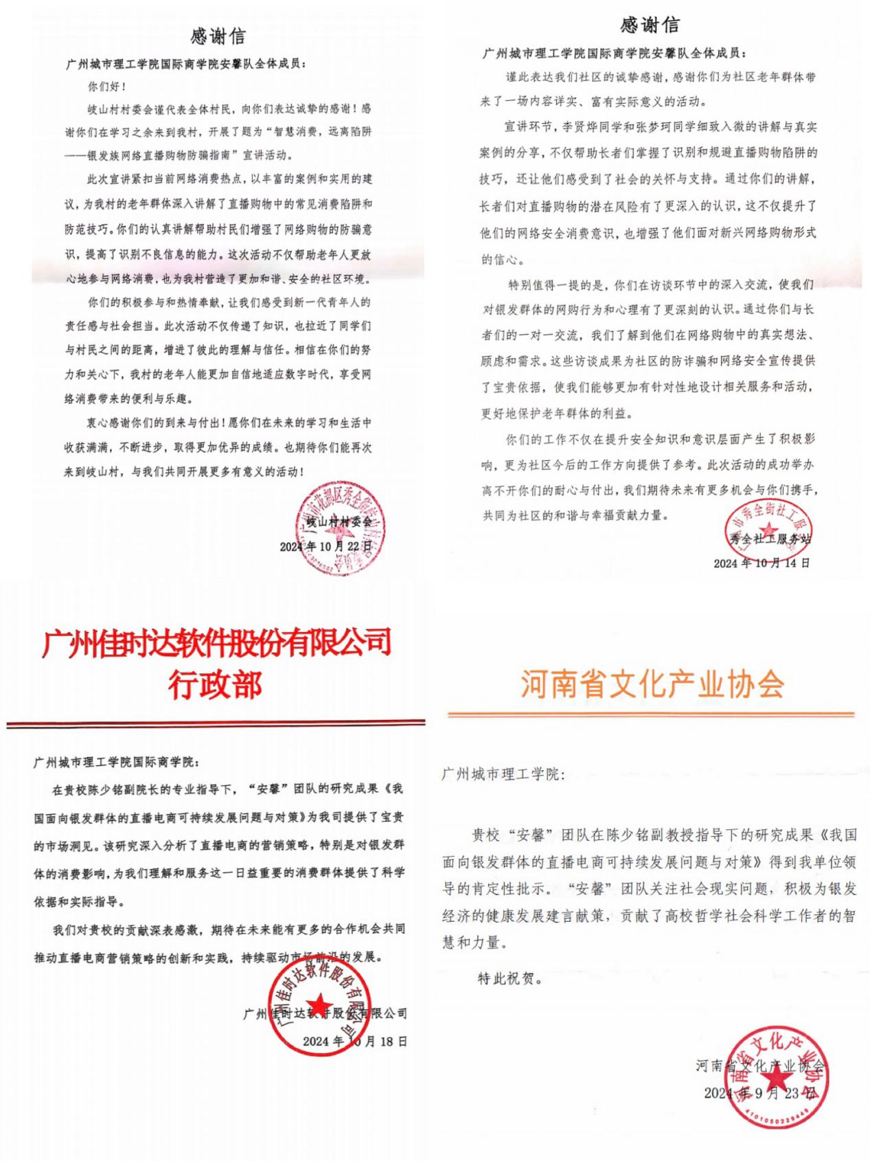 Team “Anxin” has received letters of thanks from communities, associations and enterprises since they held such lectures. For example, the Qishan village committee wrote in a letter of thanks to the team, saying that “you make us feel the sense of responsibility as youth of the new generation thanks to your active participation and passionate devotions. The activity shares related knowledge, promoting mutual understanding and trust. We believe that senior citizens in our village can better adapt to the digital age, thus enjoying the convenience and fun brought by online shopping”. Henan Cultural Industry Association commented that “Team ‘Anxin’ pays attention to social realities since they play an active part in offering suggestions on the healthy development of silver economy, which enables them to inject wisdom and strength of individuals of philosophy and social sciences from universities to the group.”